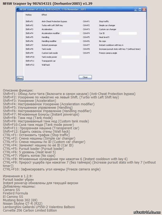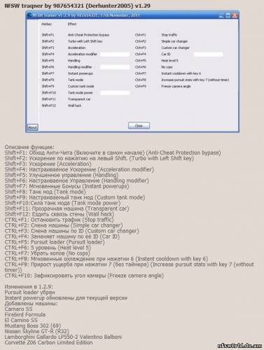 NFSW traqner by 987654321 (Derhunter2005) v1.29 Описание функции: Shift+F1: Обход Анти-Чита (Включите в самом начале) (Anti-Cheat Protection bypass) Shift+F2: Ускорение по нажатию на левый Shift. (Turbo with Left Shift key) Shift+F3: Ускорение (Acceleration) Shift+F4: Настраиваемое Ускорение (Acceleration modifier) Shift+F5: Улучшенное управление (Handling) Shift+F6: Настраиваемое Управление (Handling modifier) Shift+F7: Мгновенные Бонусы (Instant powerups) Shift+F8: Танк мод (Tank mode) Shift+F9: Настраиваемый танк мод (Custom tank mode) Shift+F10:Сила танк мода (Tank mode power) Shift+F11: Прозрачная машина (Transparent car) Shift+F12: Ездить сквозь стены (Wall hack) CTRL+F1: Остановить трафик (Stop traffic) CTRL+F2: Смена машины (Simple car changer) CTRL+F3: Смена машины по ID (Custom car changer) CTRL+F4: Заменяет машину по её ID (Car ID) CTRL+F5: Pursuit loader (Pursuit loader) CTRL+F6: 5 уровень (Heat level 5) CTRL+F7: Убрать копов (No cops) CTRL+F8: Мгновенные охлаждение при нажатии 6 (Instant cooldown with key 6) CTRL+F9: Прирост ущерба при нажатии 7 (без таймера) (Increase pursuit stats with key 7 (without timer)) CTRL+F10: Зафиксировать угол камеры (Freeze camera angle) Изменения в 1.2.9: Pursuit loader убран Instant powerup обновлены для текущей версии Добавлены машины: Camaro SS Firebird Formula El Camino SS Mustang Boss 302 (69) Nissan Skyline GT-R (R32) Lamborghini Gallardo LP550-2 Valentino Balboni Corvette Z06 Carbon Limited Edition | |