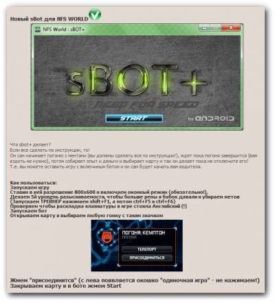Новый NFS World sBOT by Android Как пользоваться уверен знаете. бот для прокачки АКАУНТА Для нормальной работы нужен microsoft framework 4 как пользоваться: